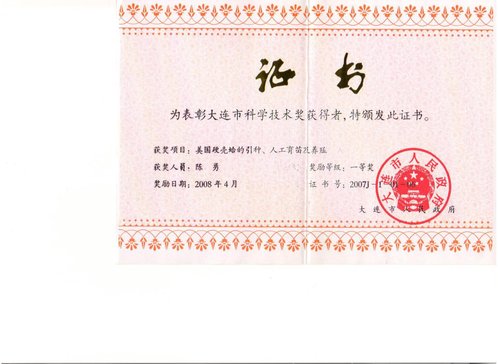 “美国硬壳蛤的引种、人工育苗及养殖”获大连市科学技术一等奖