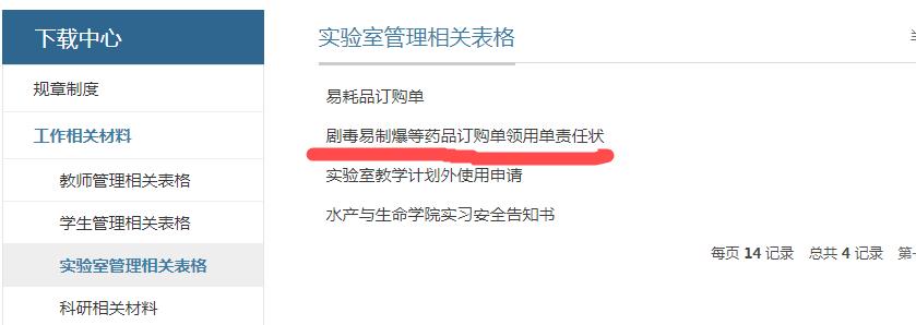 请到学院网站下载“剧毒易制毒易制爆药品订购、领用、责任状”见下图。药品为学院统一采购,故“订购领取一体”,需要填写订购单和领用单,同时签订责任状。